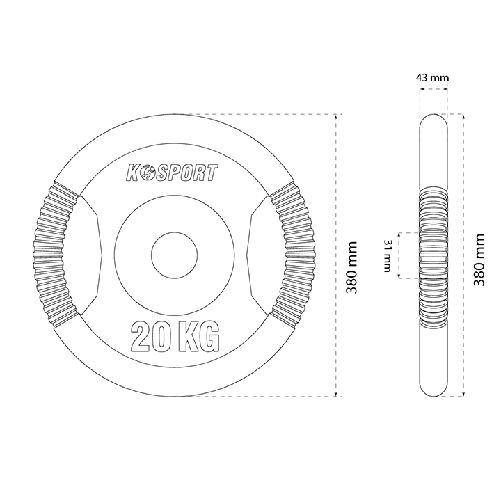 Встановлення вантажу вагою 20 кг полегшено завдяки спеціально розробленій системі. Перфоровані ручки з обох сторін полегшують перенесення ваги. Крім того, навантаження вагою 5, 10, 20 кг розроблено для використання як гирі. Тепер ви можете виконувати присідання, махи та вправи практично для кожної частини тіла з вагою K-SPORT.
