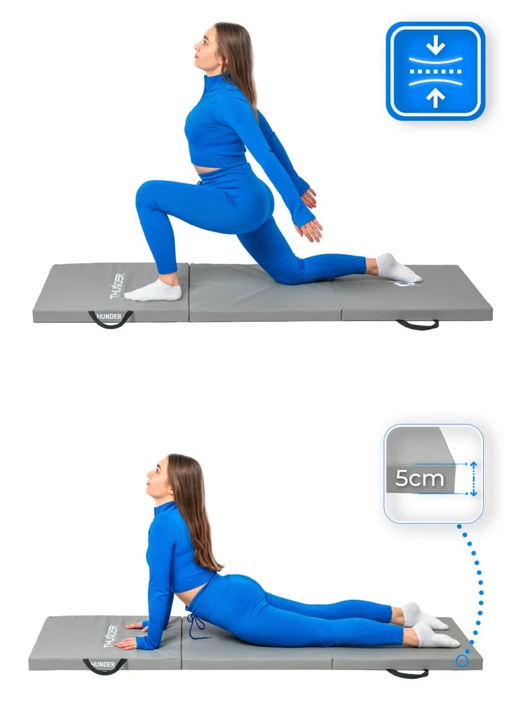 Матрац гімнастичний Thunder MG-02, 180 х 60 х 5 см, сірий - це міцна і зручна поверхня для тренувань, яка ідеально підходить для тих, хто займається гімнастикою, бойовими видами спорту та акробатикою. Завдяки своїй твердій структурі та нековзній поверхні він забезпечує відмінну стійкість.