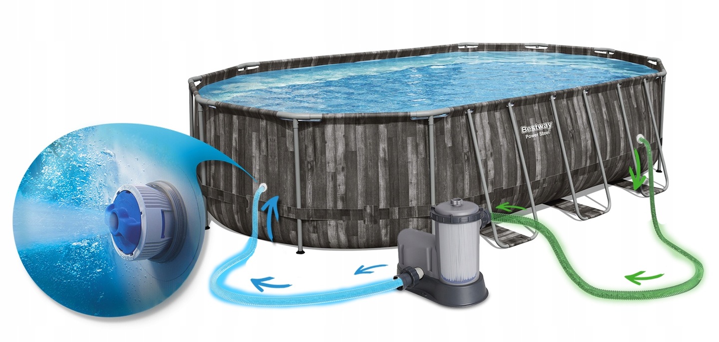 У комплекті є все необхідне для підтримання кришталево чистої води: фільтр-насос, покращений фільтр, мультитаблетки для дезінфекції, дозатор хімії, термометр та сітка для збору сміття.