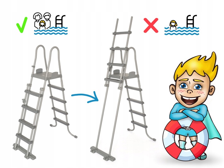 Сходи зі знімними сходинками запобігають випадковому доступу без нагляду дорослих. Висота басейну відповідає його розмірам, а міцний металевий каркас стійкий до корозії. Протиковзкі сходинки та зручні поручні гарантують комфорт і безпеку під час користування.