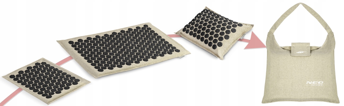 Килимок для акупресури Neo-Sport NS-902 у сіро-чорному кольорі — це трьохелементний набір із двох мат та подушки, оснащений шипованими виступами у формі троянд. Всього на матах розміщено 240 виступів, а на подушці ще 76, що забезпечує інтенсивний масаж, стимуляцію точок тіла та покращення кровообігу.