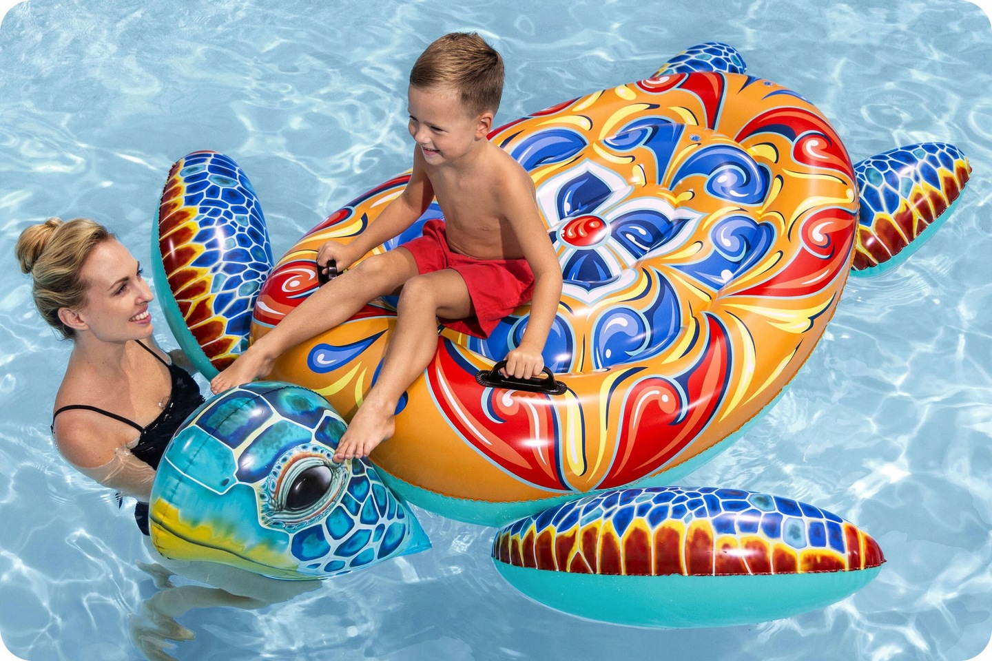 Пліт надувний для плавання Bestway 41523 у формі черепахи розміром 186 × 168 см – великий та яскравий аксесуар для літнього відпочинку на воді. Завдяки широкій поверхні, зручним ручкам та міцному матеріалу він забезпечує комфорт, безпеку та веселий настрій під час ігор у басейні чи на пляжі.