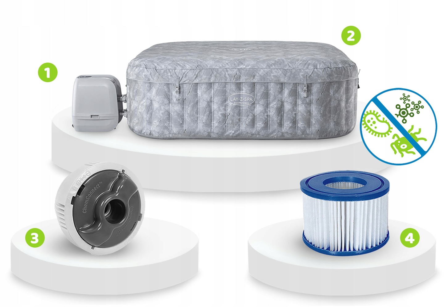 - Система фільтрації — помпа, покриття, дозатор ChemConnect та якісний фільтр підтримують чистоту води.